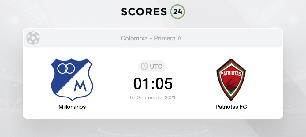 ALTRE STATISTICHE - PARTITA NON INIZIATA. Pronóstico Patriotas vs Millonarios. Millonarios vs Patriotas lunes 6 de septiembre Los derechos y créditos de la fotografía usada en este artículo no pertenecen a Juega Ganador.