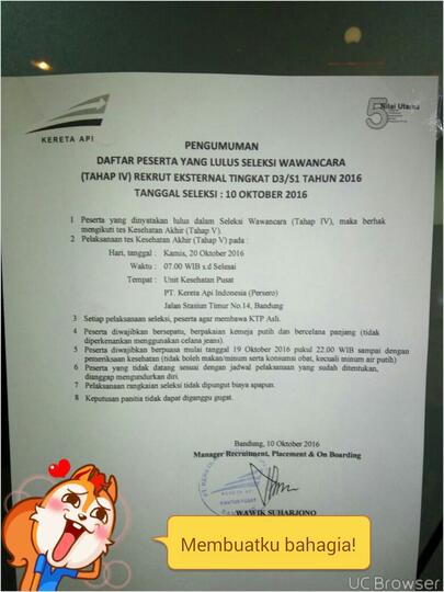 Jadi kita tidak perlu menunggu lama untuk mengetahui hasil tes kita. Yang saya sukai dari rekrutmen PT KAI adalah pengumuman kelulusannya disampaikan pada hari itu juga. Tanggal 23 Juli 2016 pengumuman rilis di website PT KAI ternyata oh teryata gue lolos tahap seleksi administrasi dan berhak ikut seleksi tahap II yaitu tes kesehatan awal tanggal 25 sd 27 Juli 2016 di BandungBaiklah mari kita breakdown tulisan ini per tahapan seleksiCekidot.